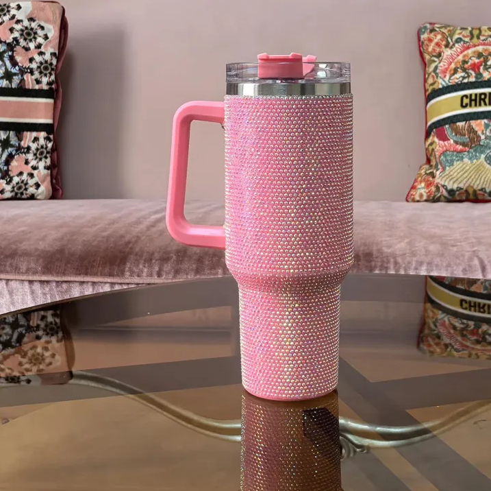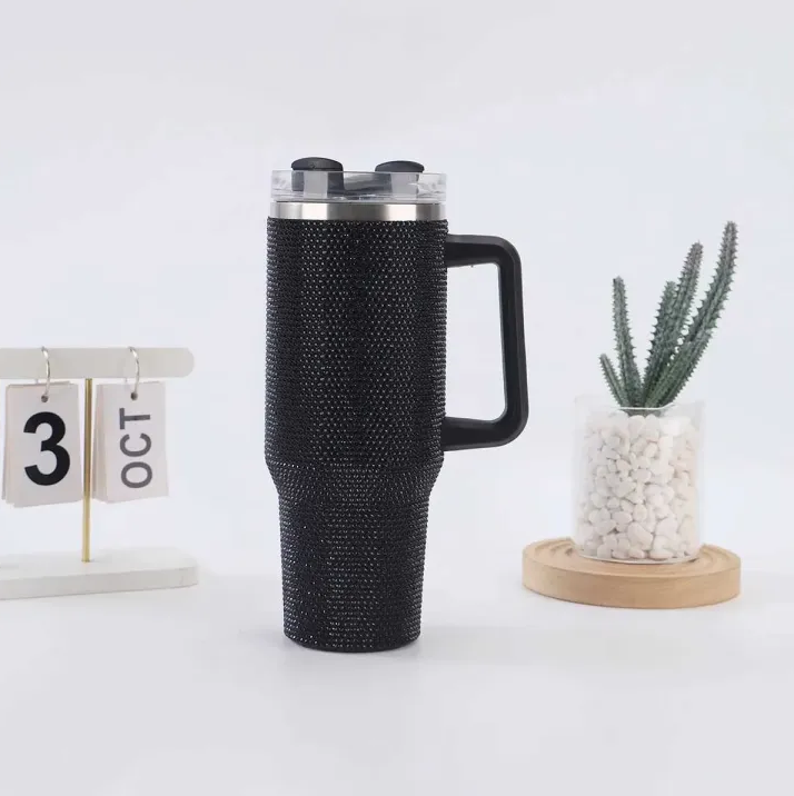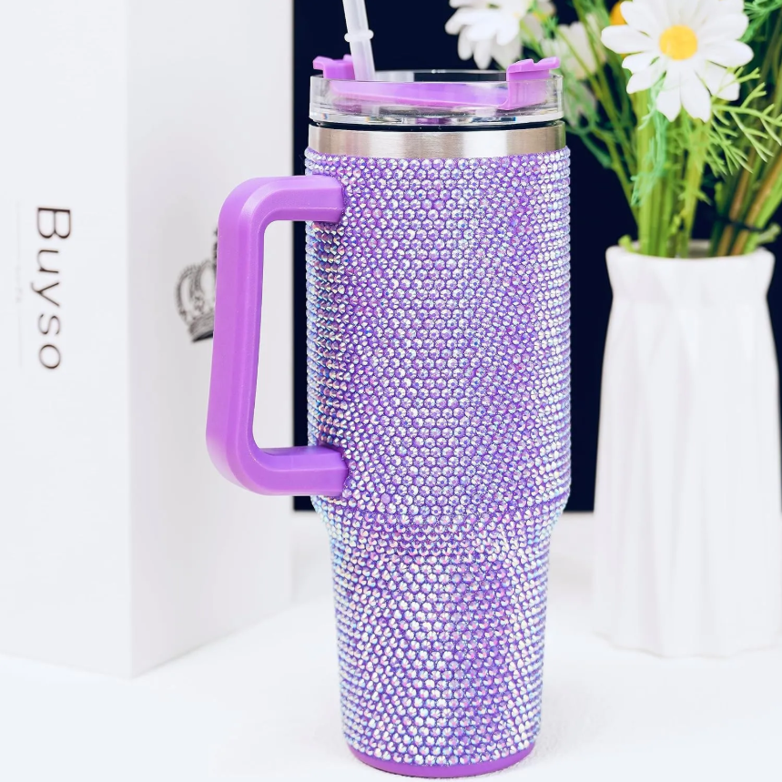 Imported Shiny Stone 40oz Stainless Steel Insulated Tumbler with Handle, Leakproof Lid and Straw, Portable Tumbler for Car, Birthday Gift Tumbler for Girls