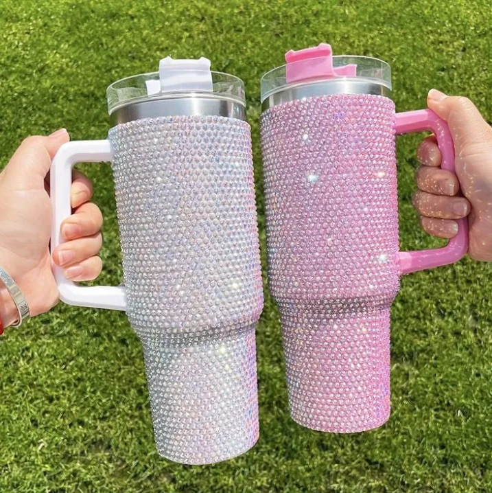 Imported Shiny Stone 40oz Stainless Steel Insulated Tumbler with Handle, Leakproof Lid and Straw, Portable Tumbler for Car, Birthday Gift Tumbler for Girls